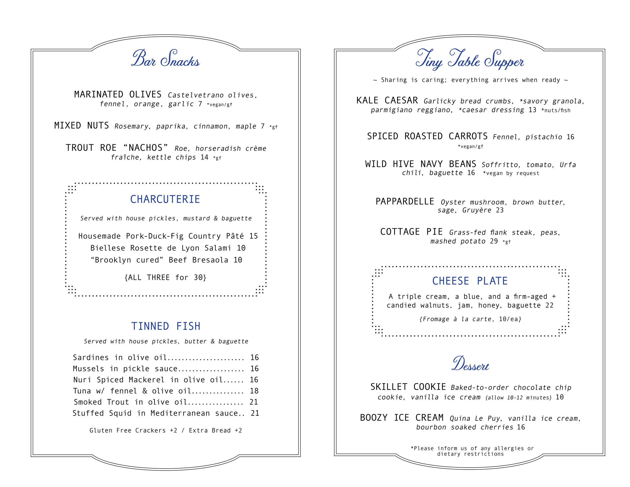 We make fun snacks and thoughtful small plates to pair with our extensive, ever-changing wine list. Due to the size of our kitchen, ordering to share is highly encouraged as everything arrives when ready.